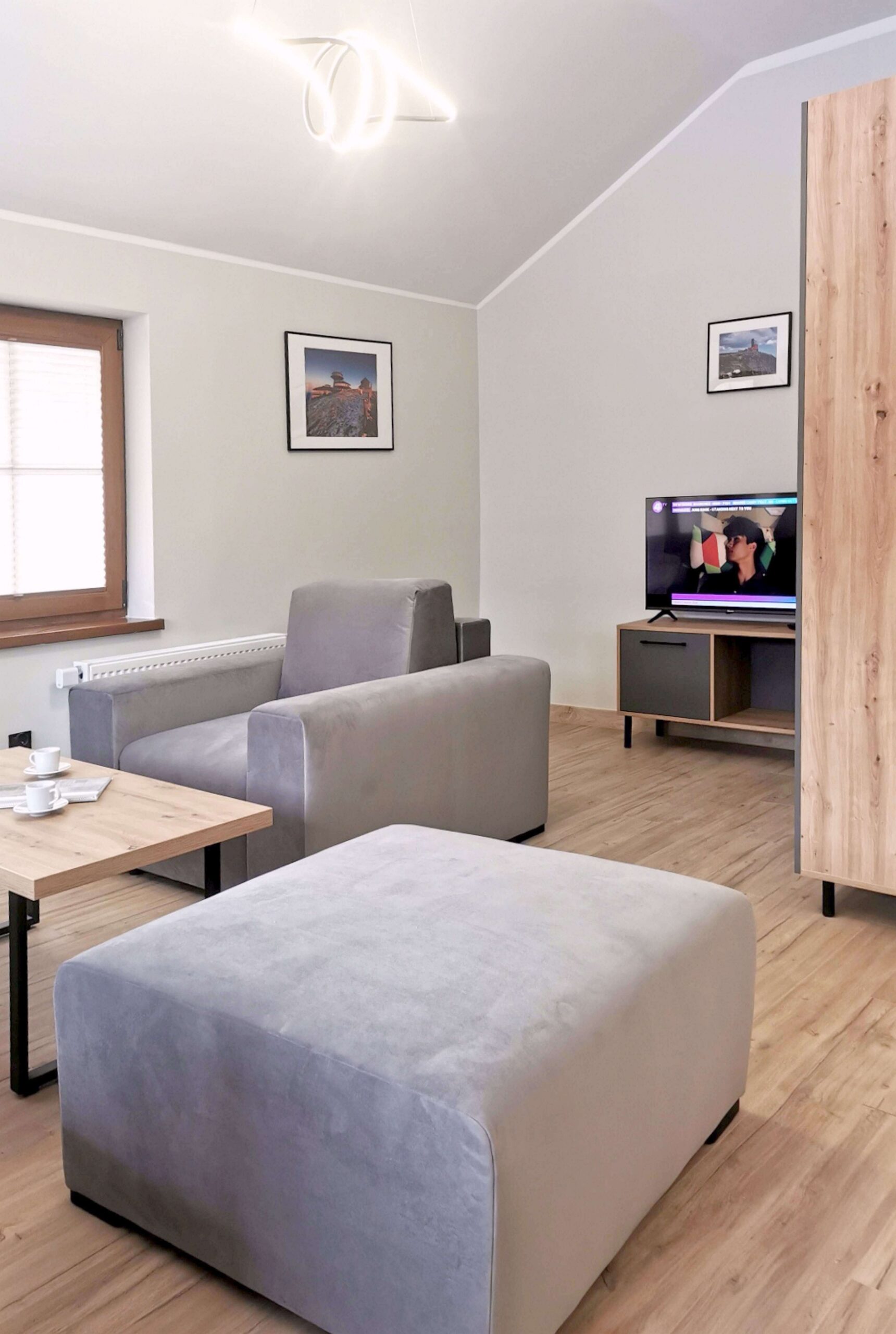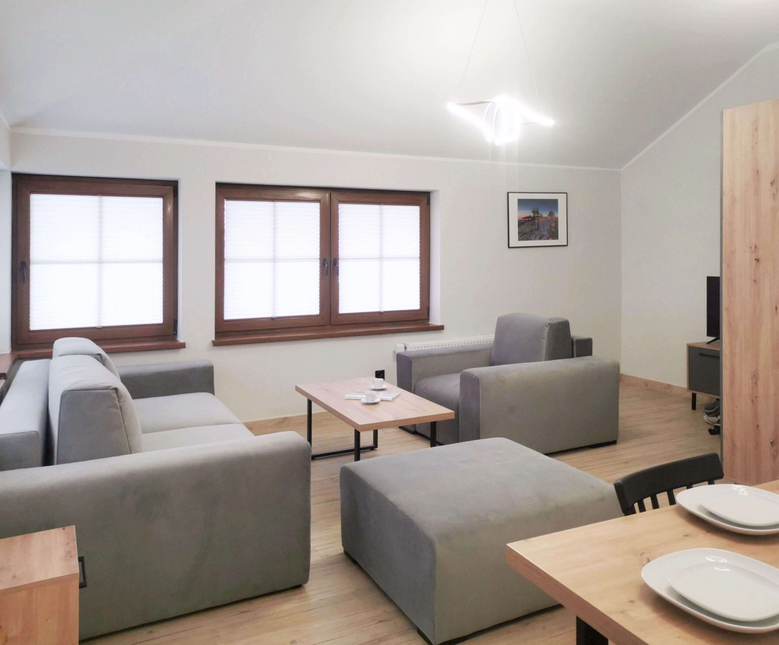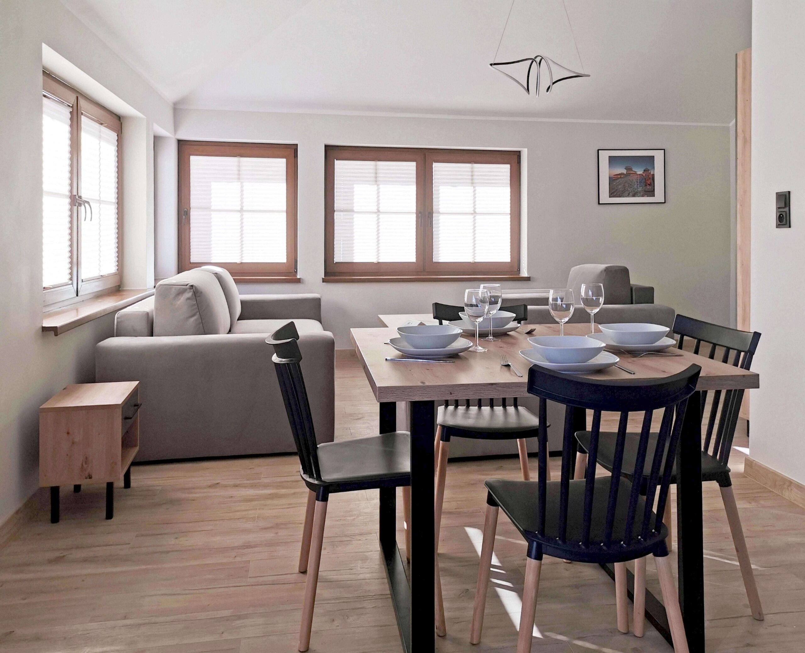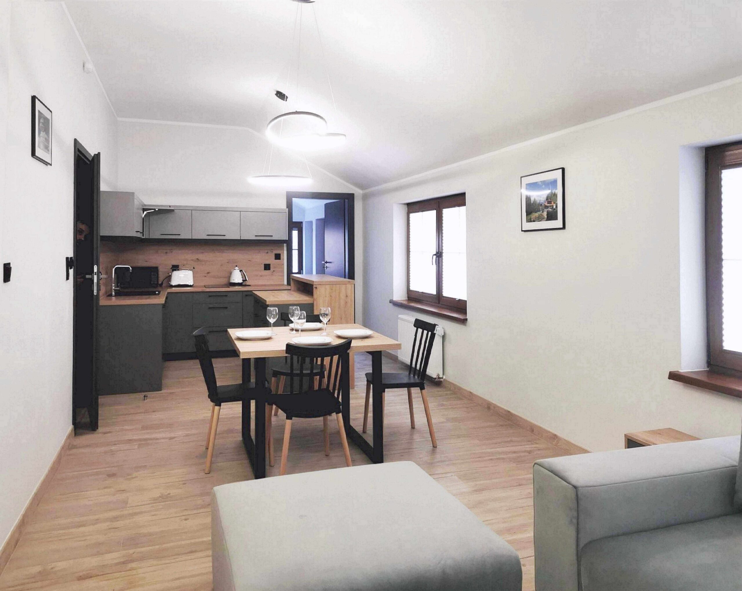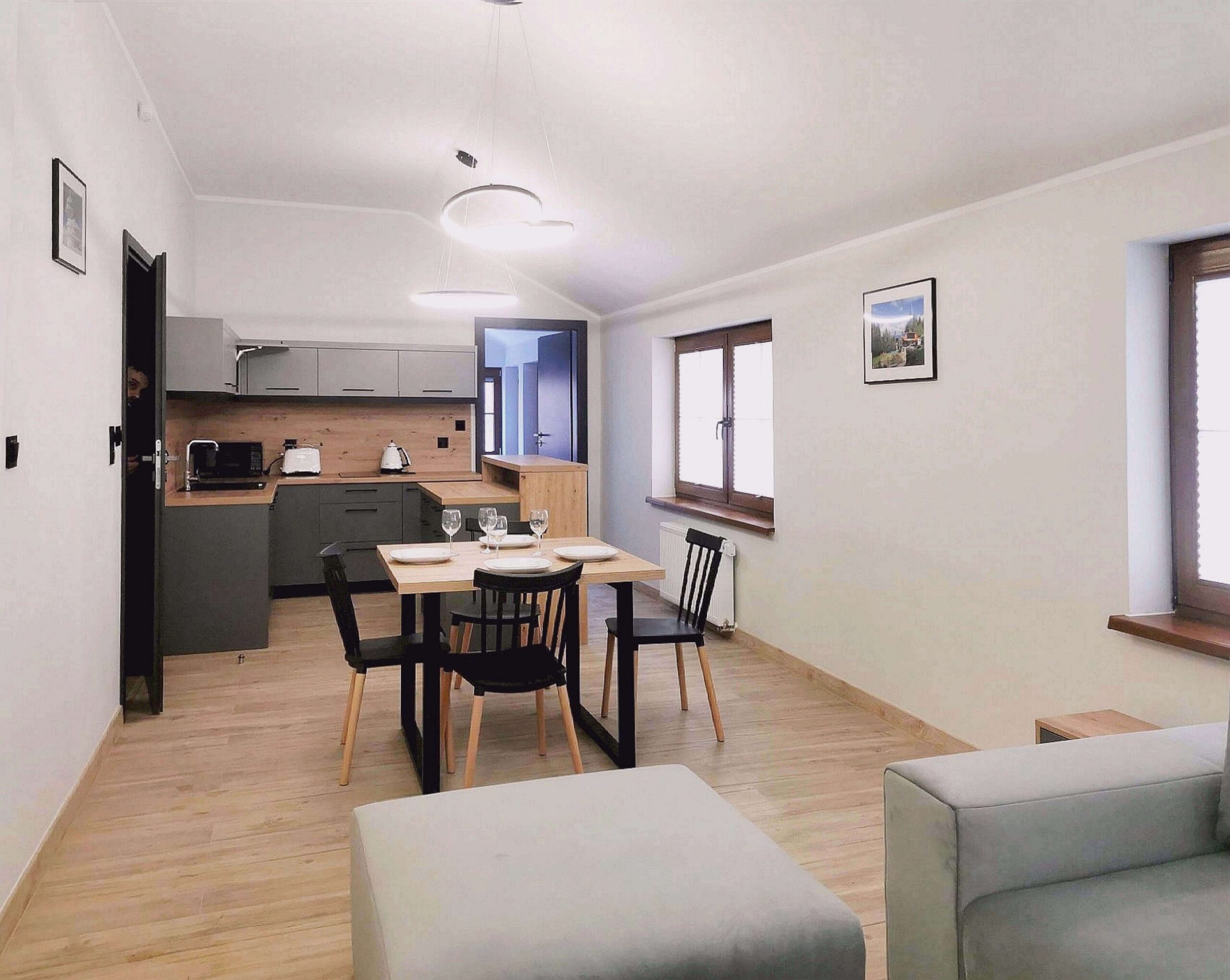 Nasz przestronny apartament, o powierzchni około 58 m², został zaprojektowany z myślą o zapewnieniu wygody pobytu dla czterech osób. Apartament oferuje otwarty plan połączenia aneksu kuchennego z salonem, co tworzy przestronną i funkcjonalną przestrzeń do wspólnego spędzania czasu. Prywatna sypialnia z łóżkiem małżeńskim oraz nowoczesna łazienka z prysznicem zapewniają komfort i intymność. Dostęp do apartamentu, który znajduje się przy dolnym parkingu, możliwy jest po schodach. Dla miłośników sportów zimowych udostępniamy narciarnię, z łatwym dostępem z zewnątrz na kod, znajdującą się przy górnym parkingu.