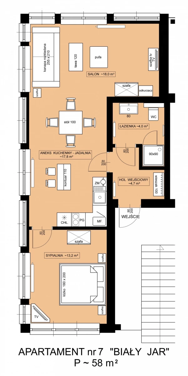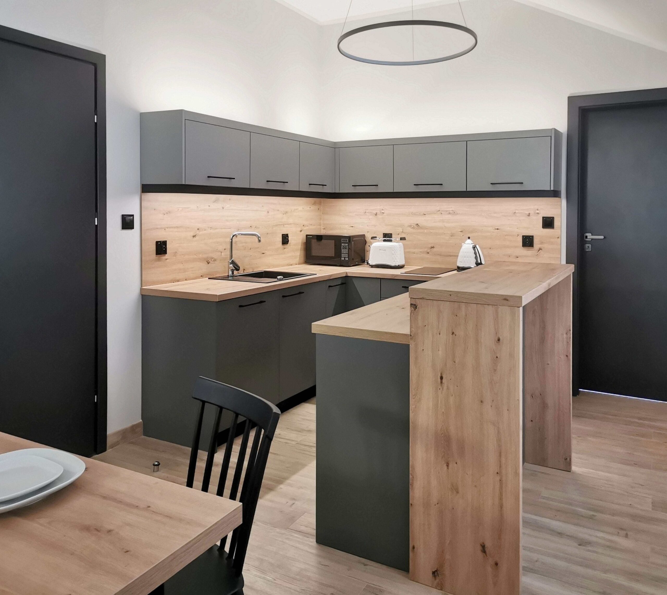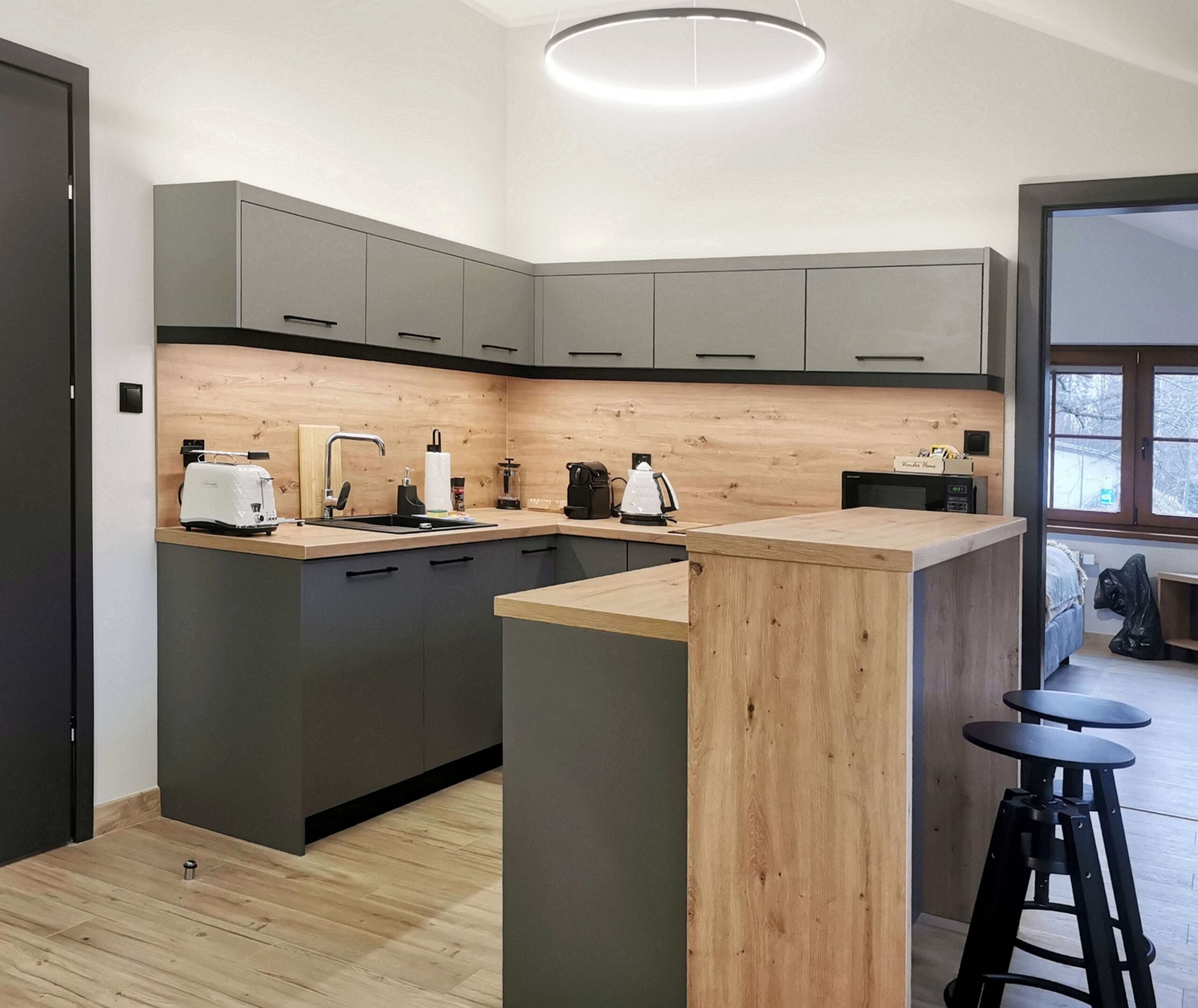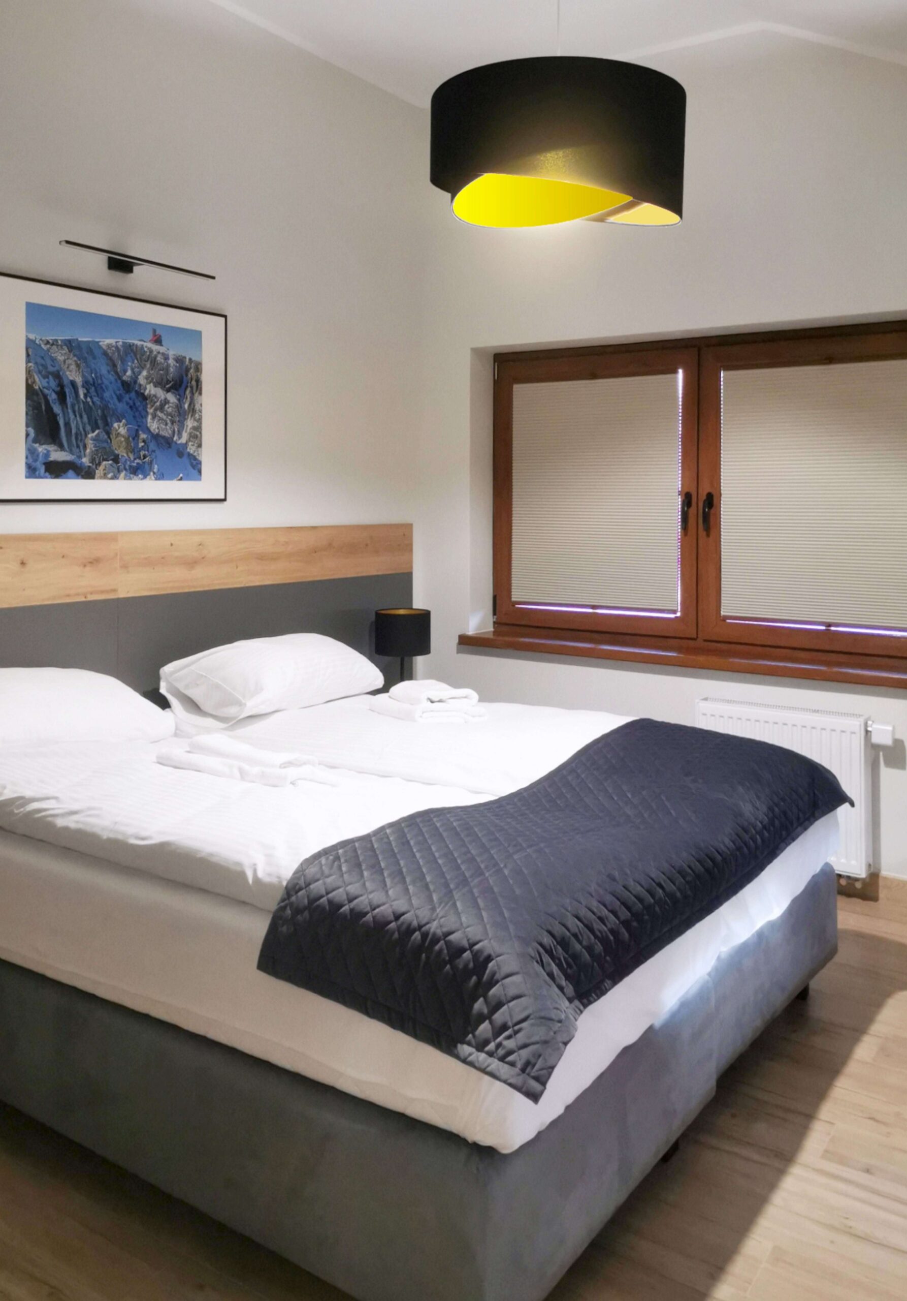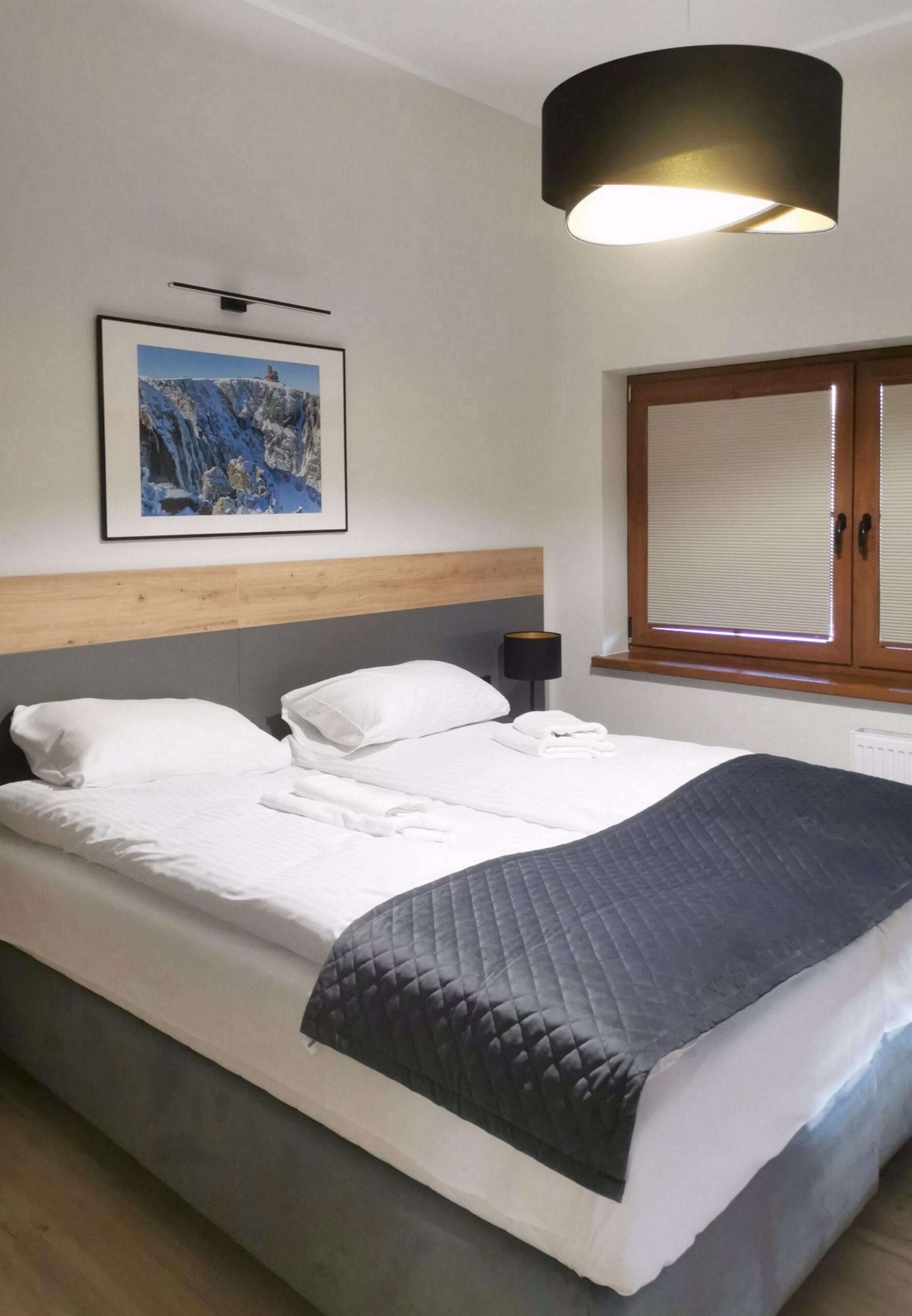 Nasz przestronny apartament, o powierzchni około 58 m², został zaprojektowany z myślą o zapewnieniu wygody pobytu dla czterech osób. Apartament oferuje otwarty plan połączenia aneksu kuchennego z salonem, co tworzy przestronną i funkcjonalną przestrzeń do wspólnego spędzania czasu. Prywatna sypialnia z łóżkiem małżeńskim oraz nowoczesna łazienka z prysznicem zapewniają komfort i intymność. Dostęp do apartamentu, który znajduje się przy dolnym parkingu, możliwy jest po schodach. Dla miłośników sportów zimowych udostępniamy narciarnię, z łatwym dostępem z zewnątrz na kod, znajdującą się przy górnym parkingu.