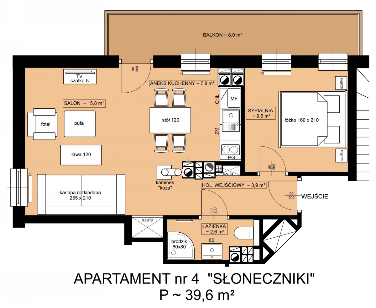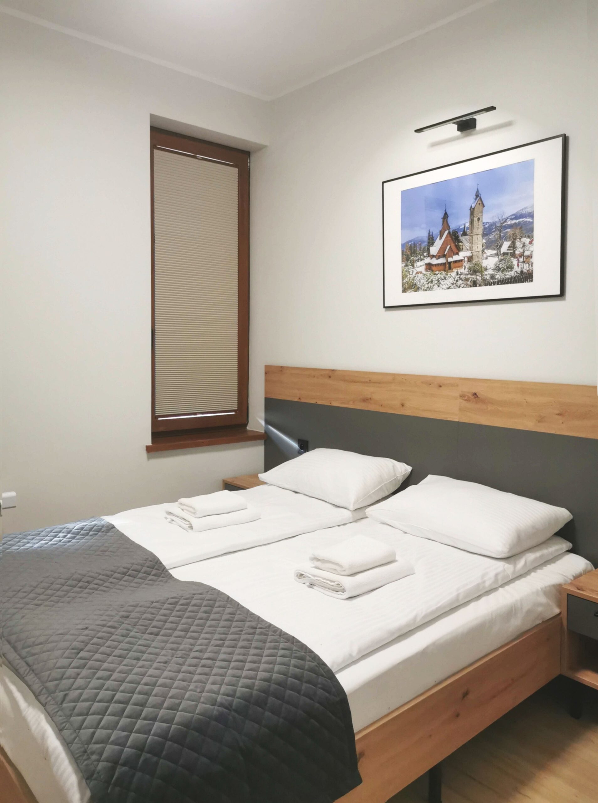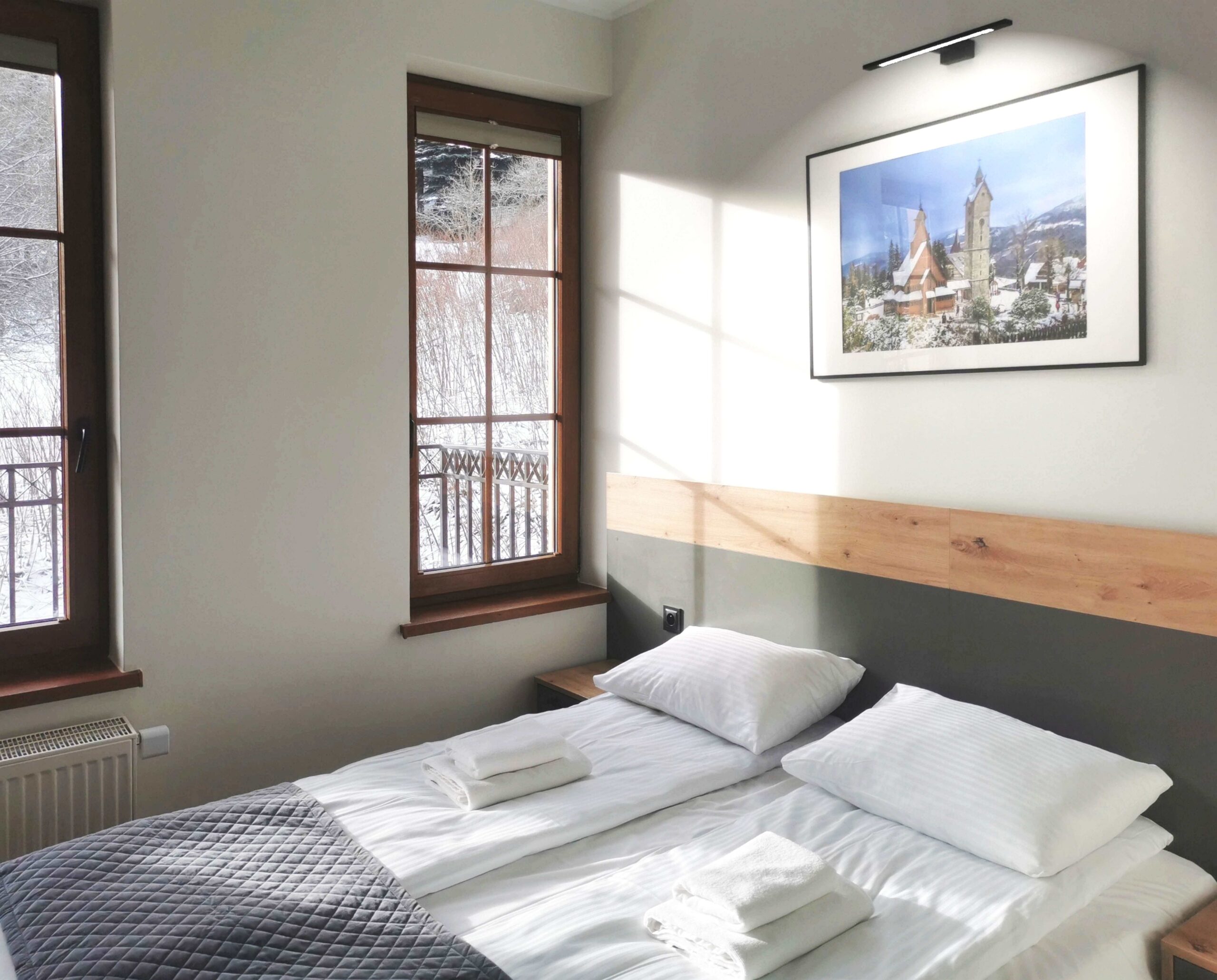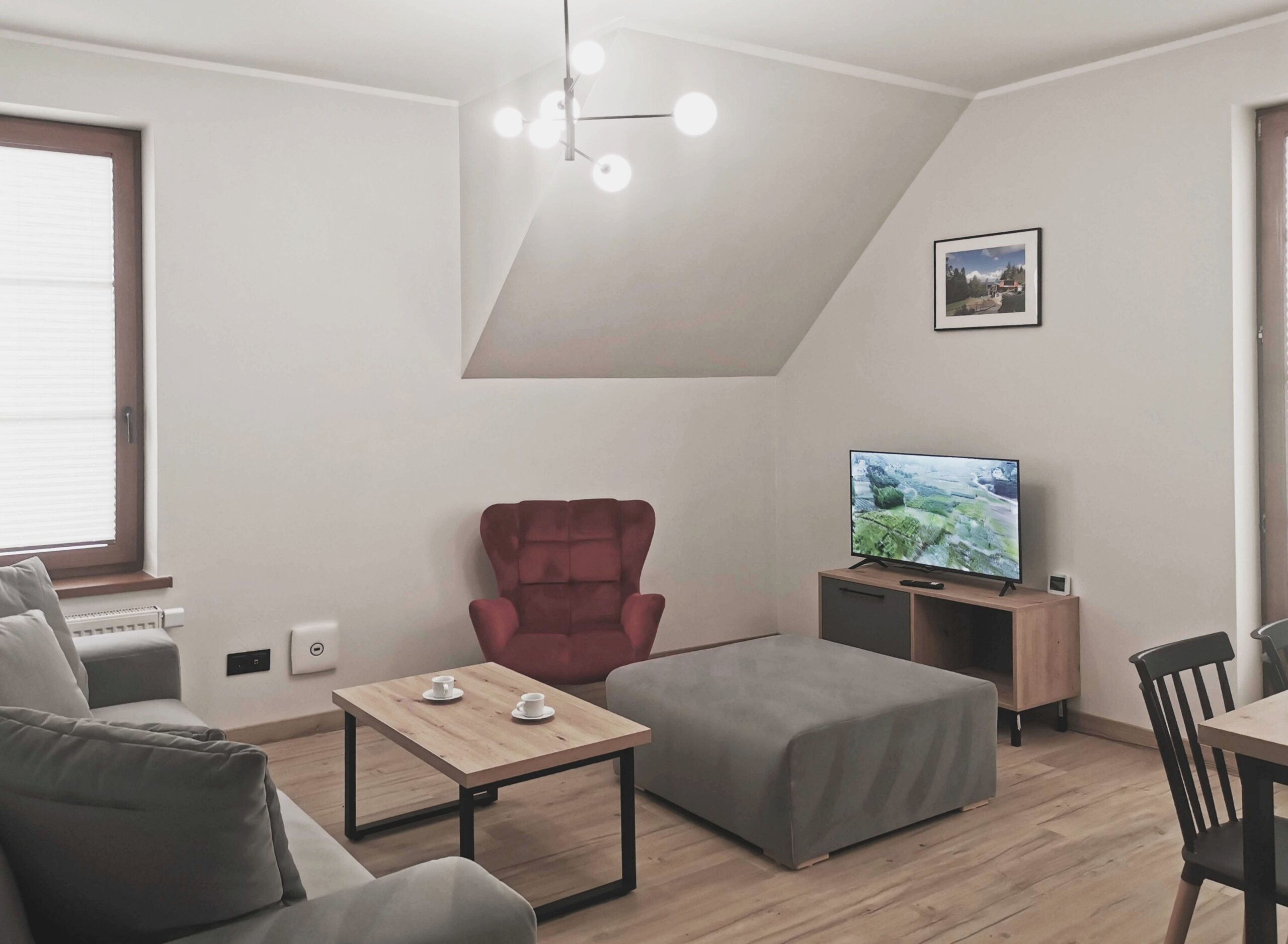 Ten przestronny apartament o powierzchni około 39 m², zaprojektowany z myślą o wygodzie do czterech osób, oferuje doskonale wyposażony aneks kuchenny, sypialnię z komfortowym łóżkiem małżeńskim, salon z przytulnym kominkiem oraz nowoczesną łazienkę z prysznicem. Z salonu prowadzi drzwi na urokliwy balkon, na którym znajdują się meble ogrodowe – idealne miejsce do relaksu na świeżym powietrzu. Dostęp do apartamentu zapewniony jest od strony górnego parkingu, gdzie znajduje się wejście na klatkę schodową. Dla entuzjastów sportów zimowych dostępna jest także narciarnia, zabezpieczona kodem.