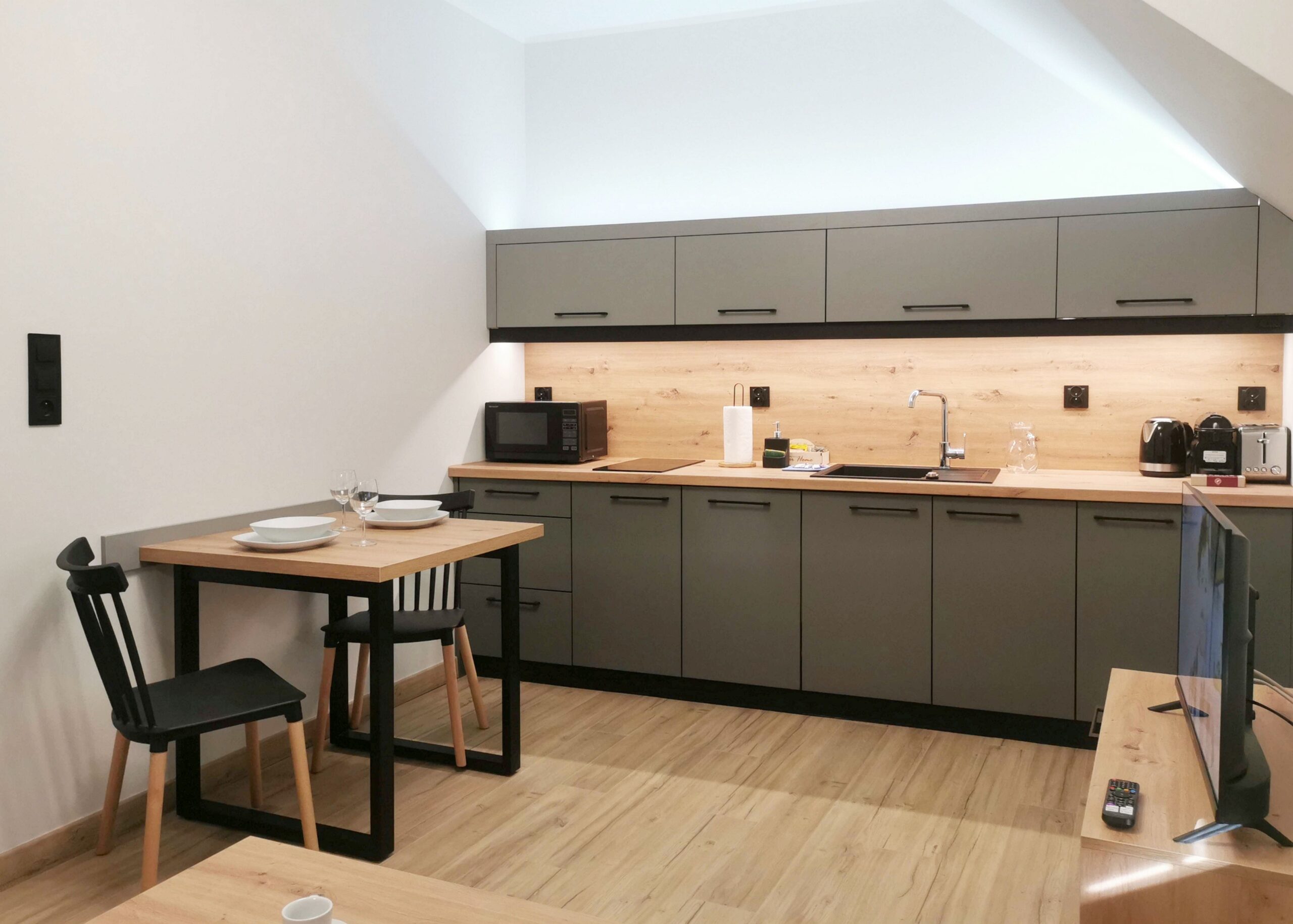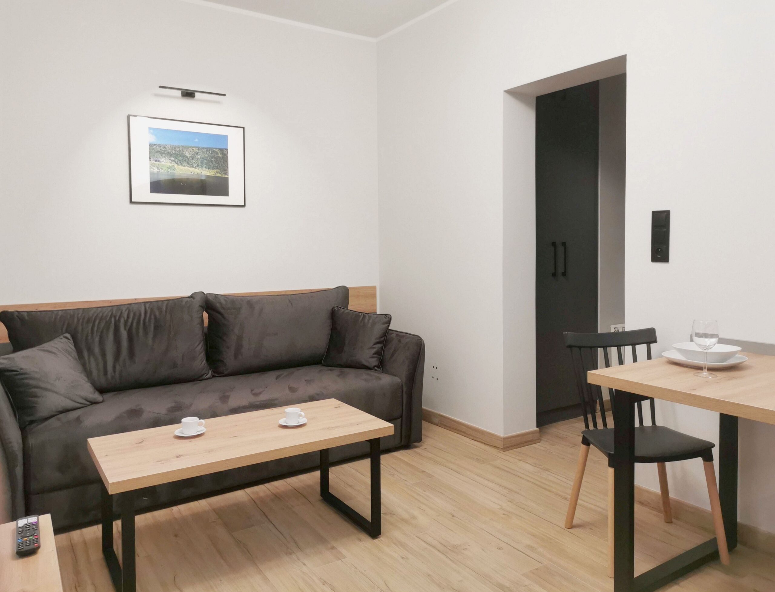 Nasz kompaktowy apartament studio, rozciągający się na około 20 m², jest idealnie dopasowany do potrzeb dwóch osób. W jego skład wchodzi funkcjonalnie wyposażony aneks kuchenny, dwuosobowa sofa, zapewniająca wygodne miejsce do wypoczynku, oraz elegancka łazienka z prysznicem. Dostęp do apartamentu zapewniony jest od strony górnego parkingu, gdzie znajduje się wejście na klatkę schodową. Goście mają również do swojej dyspozycji narciarnię, dostępną z zewnątrz na kod, co jest wygodnym rozwiązaniem dla miłośników sportów zimowych.