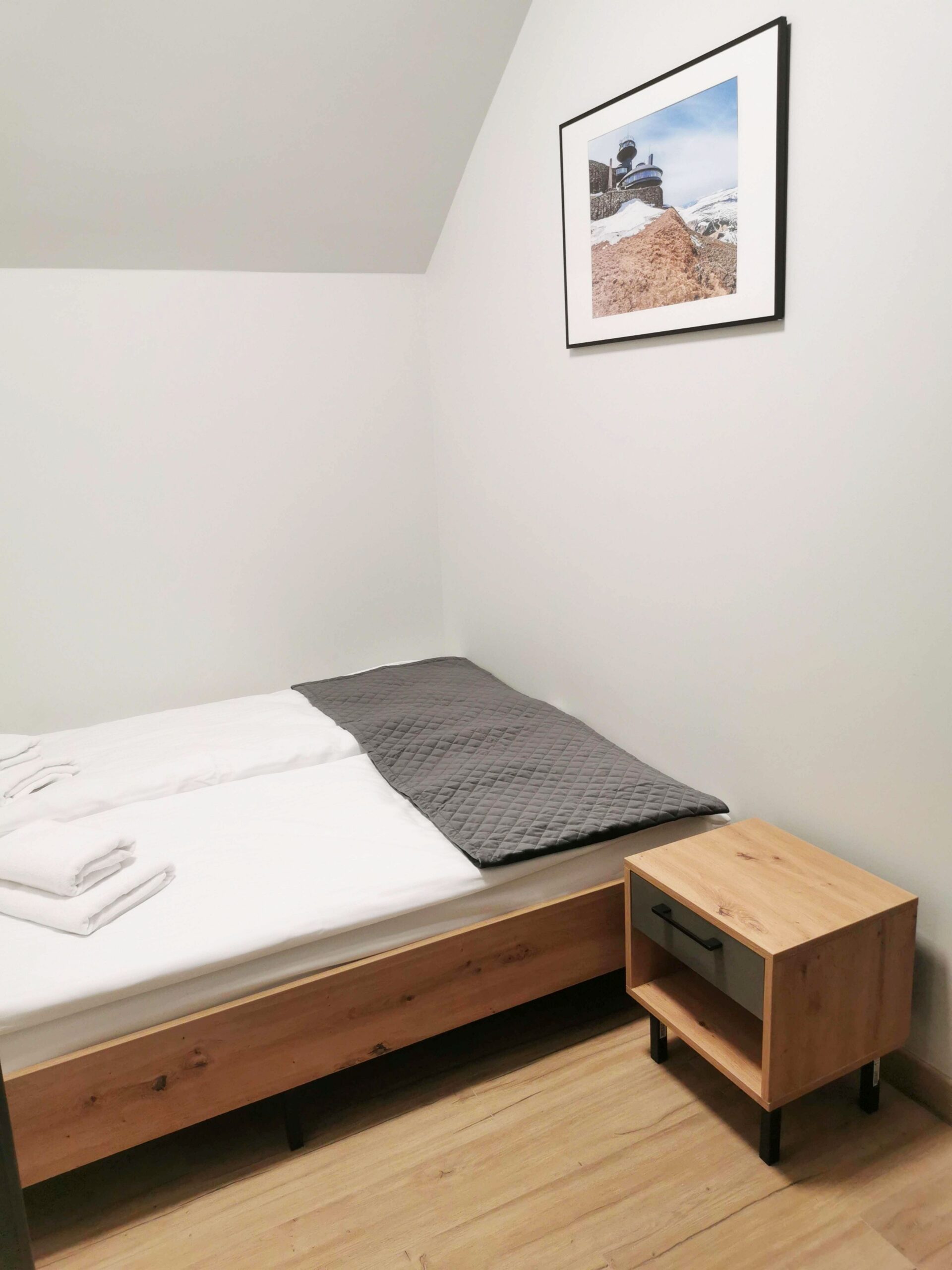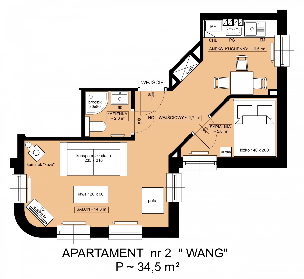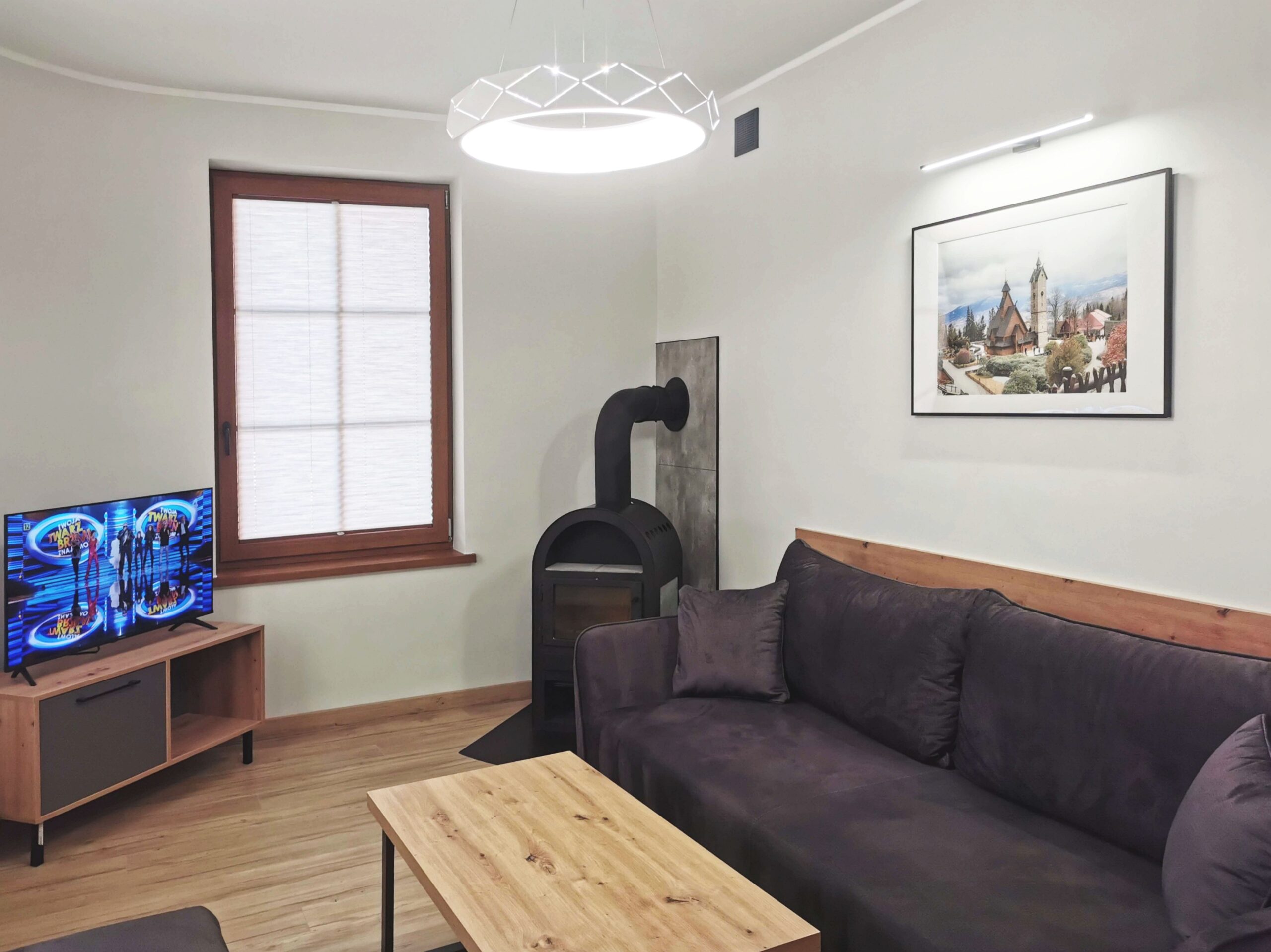 Ten przytulny apartament o powierzchni 35 m² może komfortowo gościć 4 osoby. Wyposażony jest w funkcjonalny aneks kuchenny, sypialnię z łóżkiem małżeńskim, które zapewnia prywatność, salon wyposażony w kominek dla ciepłych, rodzinnych wieczorów oraz nowoczesną łazienkę z prysznicem. Dostęp do budynku znajduje się przy górnym parkingu, a dla miłośników zimowych sportów dostępna jest narciarnia na sprzęt, zabezpieczona kodem.