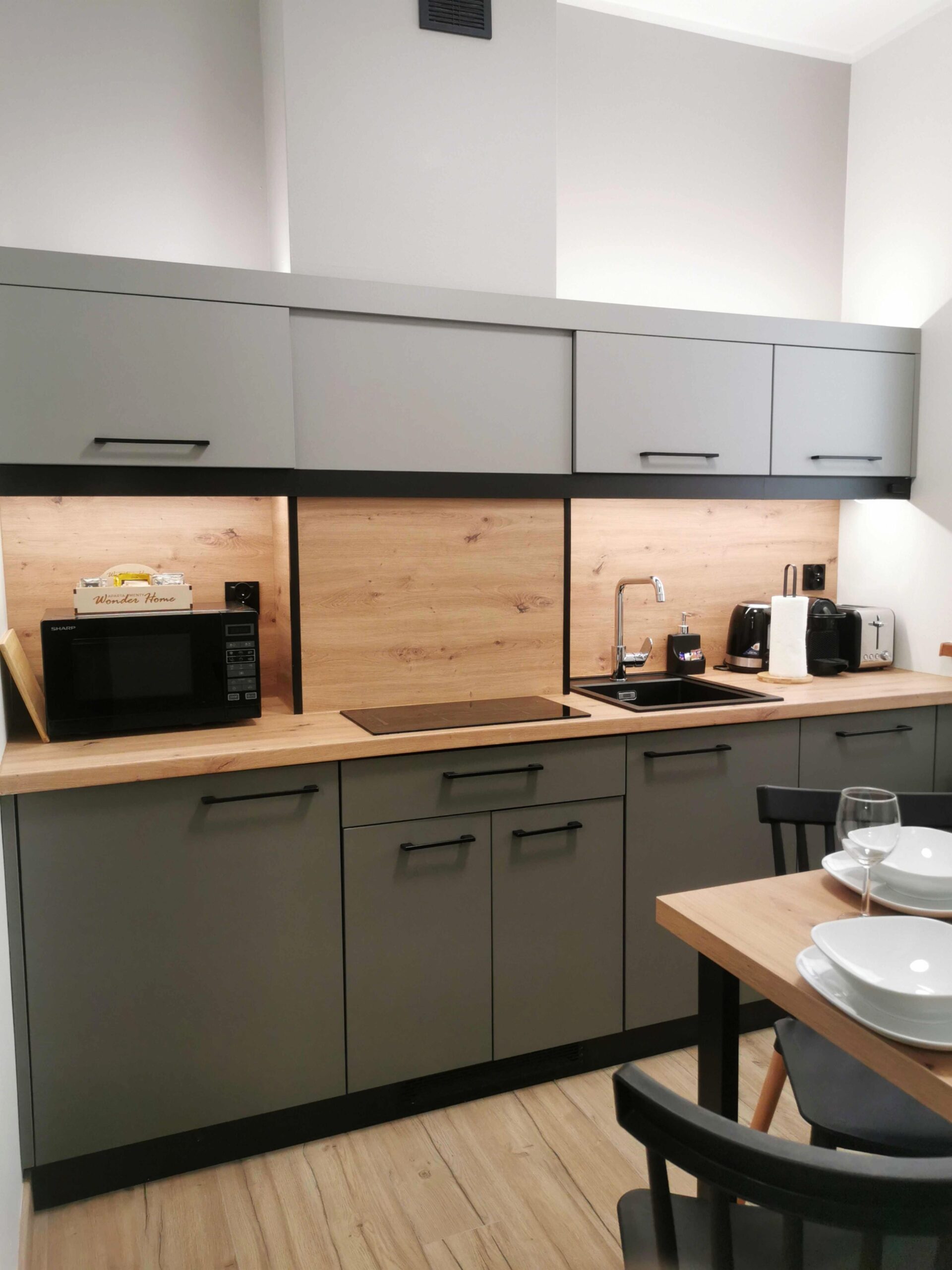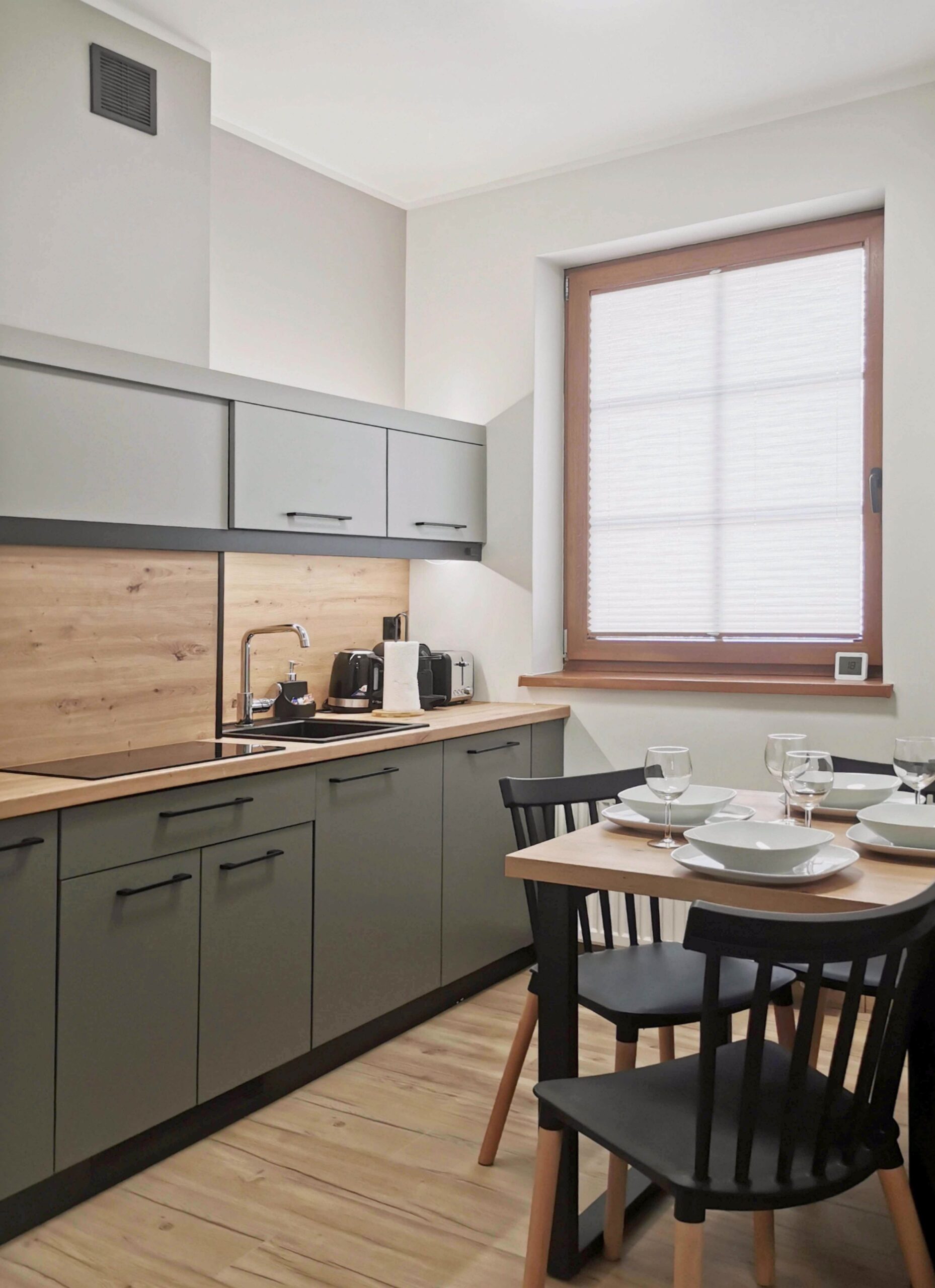 W ramach dbałości o komfort naszych Gości, każdy apartament wyposażony jest w bezpłatny zestaw powitalny zawierający niezbędne artykuły, takie jak papier toaletowy, mydło, płyn do mycia naczyń, tabletki do zmywarki (w przypadku dostępności zmywarki), gąbkę, worki na śmieci, a także kawę, herbatę, cukier i przyprawy, eliminując potrzebę natychmiastowych zakupów po przyjeździe.